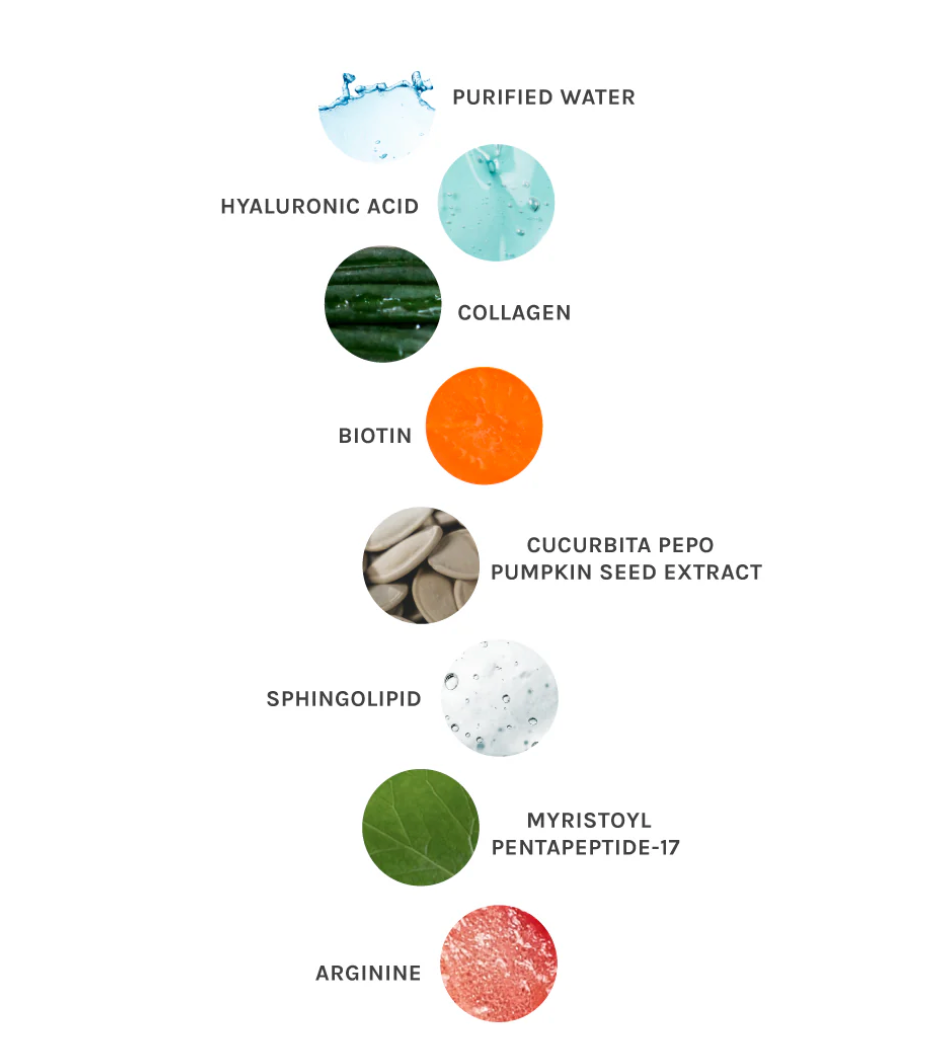Ingrédients : Aqua, acide hyaluronique, phytocollagène, biotinoyl tripeptide-1, extrait de graines de citrouille Cucurbita Pepo, sphingolipide, myristoyl pentapeptide-17, arginine