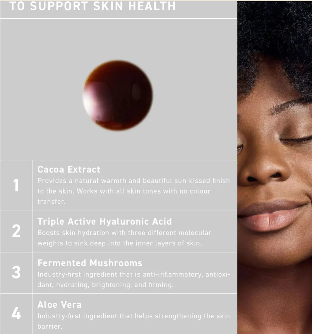 Aqua (eau), dihydroxyacétone, diméthyl isosorbide, propanediol, érythrulose, glycérine, extrait de Theobroma cacao (cacao), hyaluronate de sodium, hyaluronate de sodium acétylé, polymère croisé d'hyaluronate de sodium, hyaluronate de sodium hydrolysé, extrait de Crithmum Maritimum, extrait de Lentinus Edodes, extrait de Trametes Versicolor, squalane, jus de feuille d'Aloe Barbadensis, tocophérol, bakuchiol, phénoxyéthanol, gomme xanthane, hectorite, esters de jojoba hydrolysés, parfum (fragrance), éthylhexylglycérine, métabisulfite de sodium, linoléate de glycéryle, pentylène glycol, gluconolactone, acide citrique, filtrat de lysat de fermentation de Saccharomyces, extrait de fruit de Terminalia Ferdinandiana, linolénate de glycéryle, benzoate de sodium, sorbate de potassium