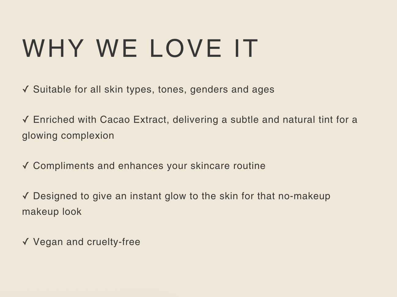 Spécialement formulées à base d'extrait de cacao naturel, d'acide hyaluronique triple actif et 4D, d'aloe vera et de champignons fermentés, ces gouttes autobronzantes teintées se fondent parfaitement à votre crème hydratante, sérum ou maquillage, pour un éclat instantané, une hydratation intense et un teint personnalisable.