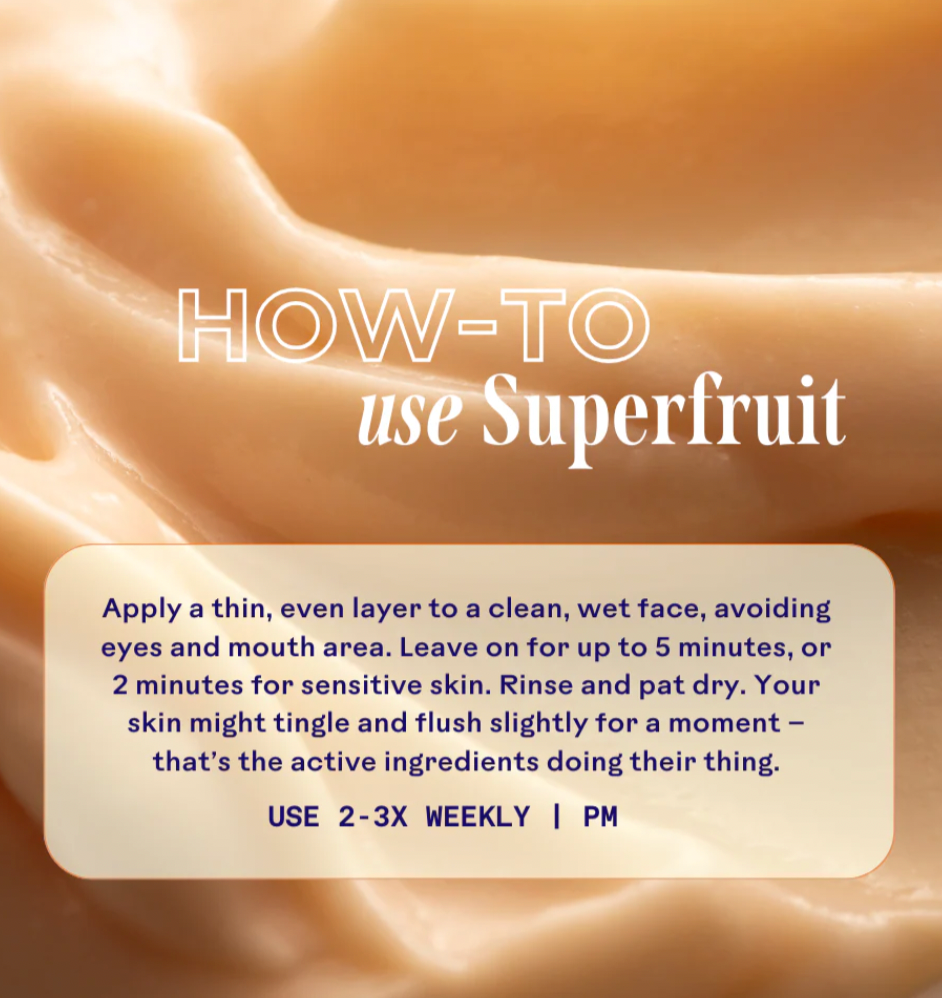 Masque exfoliant doux pour tous types de peau, les poudres de riz exfoliantes de Superfruit polissent la peau, tandis que les AHA de fruits illuminent et éliminent les cellules mortes. Les acides lactiques et de fruits renouvellent en douceur la peau terne et congestionnée, tandis que l'aloe vera apaise et hydrate.