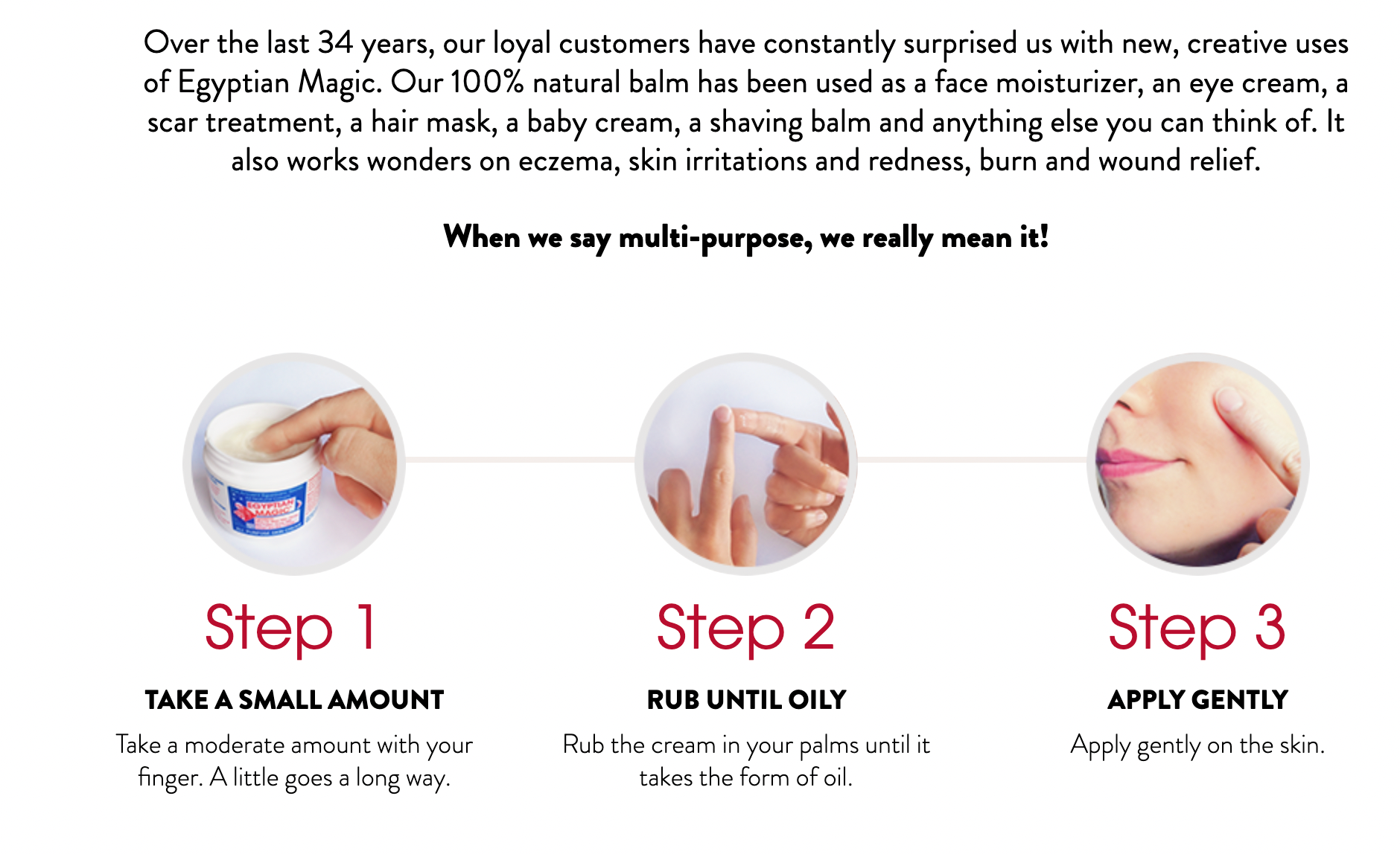 Egyptian Magic All-Purpose Skin Cream mission is to continually provide a Professional skin care product, with multiple purposes, to nurture skin with natures most effective ingredients, so our clients can feel and look beautiful using a 100% Natural Product. With its unique formula,