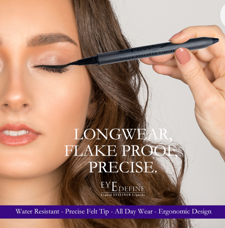 EyE Define is the latest trend for creating that perfect black line. EyE Define is an impressive black, liquid eyeliner. The ergonomics of the EyE Define offers effortless manipulation and its formula not only glides easily as a water-resistant line, but also helps to make it easy to create precision when applying a liquid eyeliner!